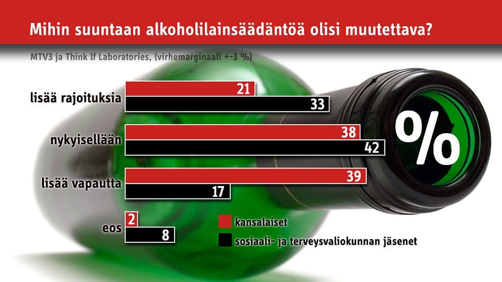 MTV3 Uutiset kysyi aiheesta myös asiaa käsittelevän sosiaali- ja terveyslautakunnan jäseniltä. Heistä vajaa puolet pitäisi lain nykyisellään ja noin kolmasosa lisäisi rajoituksia alkoholilakiin.