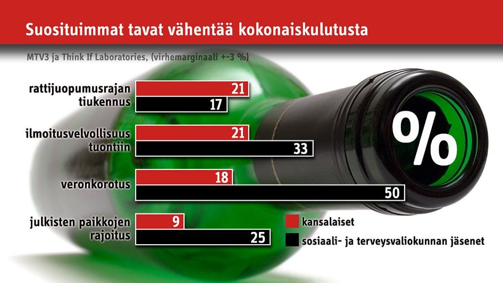 Jopa puolet valiokunnan jäsenistä näkisi tehokkaimpana keinona alkoholin kokonaiskulutuksen vähentämiseksi alkoholiveron noston. Vastaavasti kansalaisista verojen korotusta kannattaa vain alle viidennes.