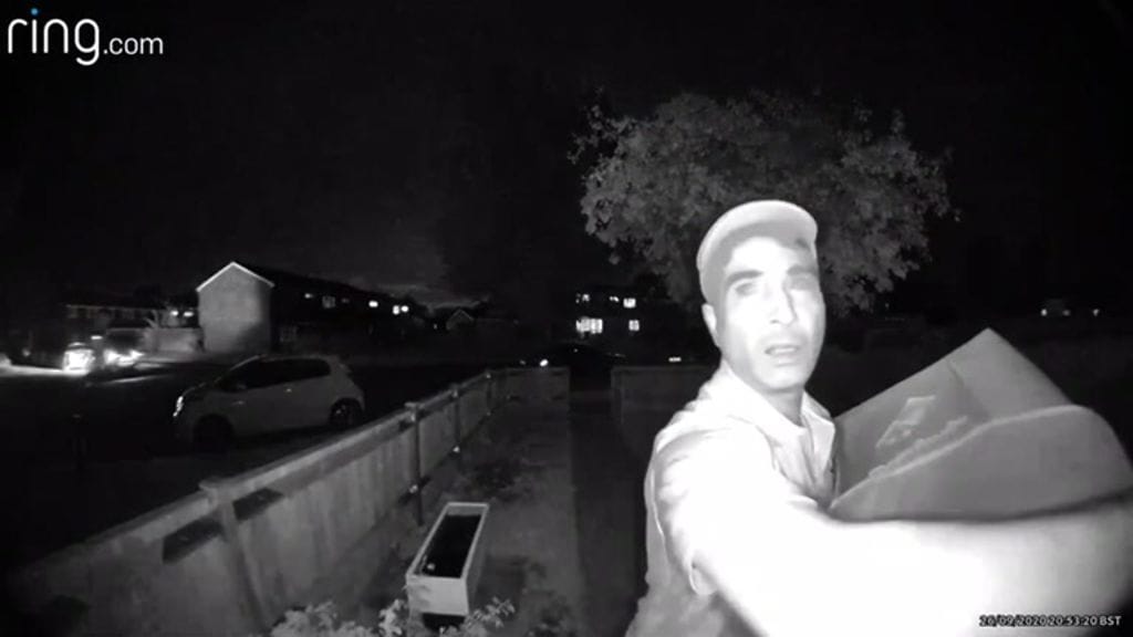 Talon valvontakameralle tallentui tilanne pihaan saapuneesta ruokalähetistä, joka painoi normaaliin tapaan ovikelloa.