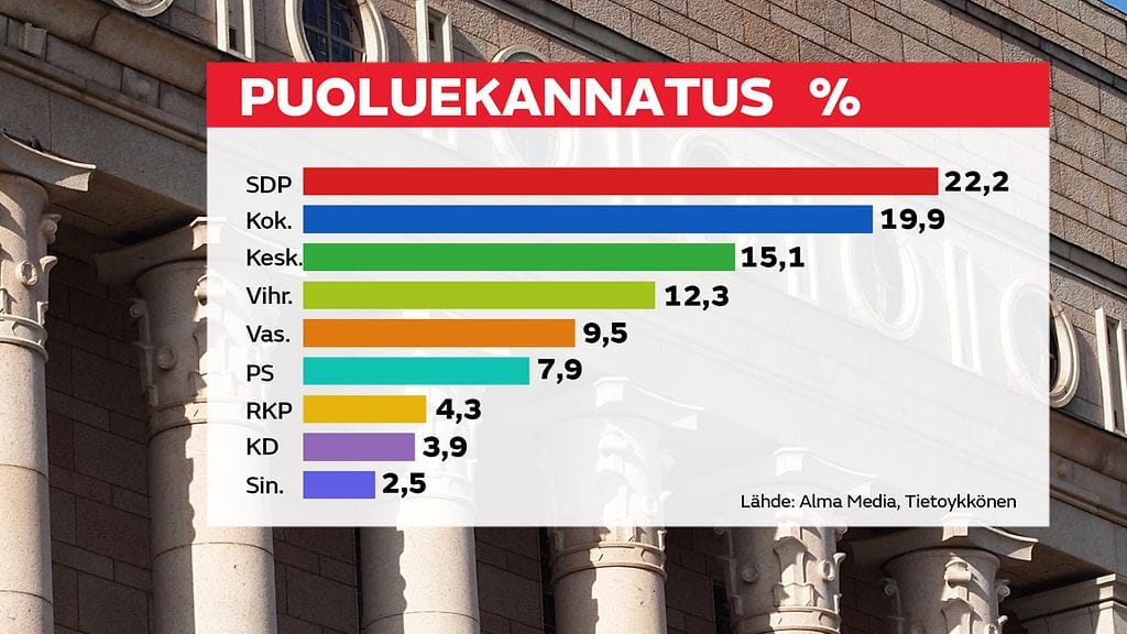 Tuoreen kannatusmittauksen tulosten mukaan SDP:tä kannattaa nyt 22,2 prosenttia suomalaisista. Puolueen kannatus on ollut kasvussa kesäkuun mittauksesta lähtien, jolloin luku oli 20,2.