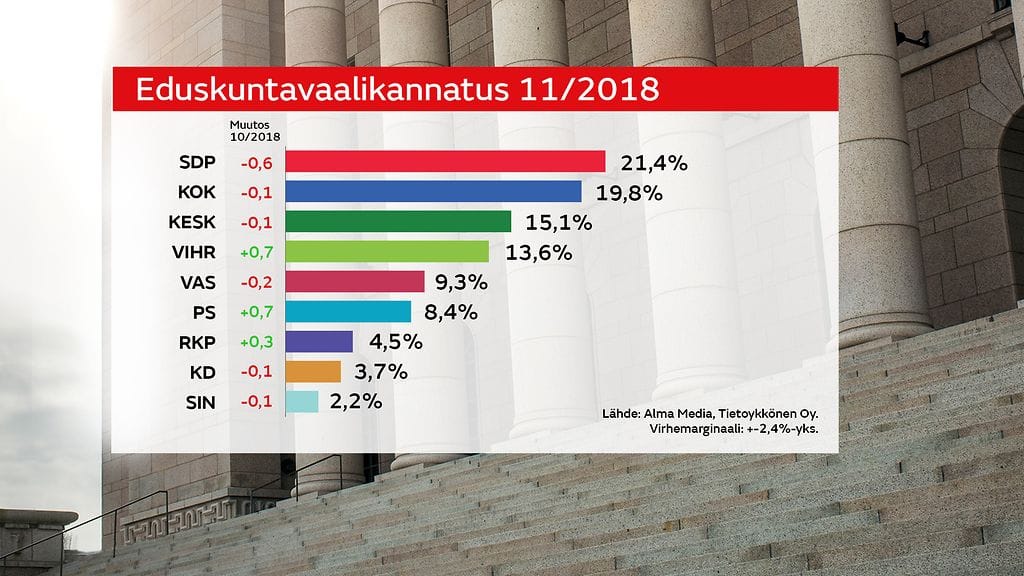 SDP:n kannatus putosi viime kuun kyselyyn verrattuna 0,6 prosenttiyksikköä prosenttia 21,4 prosenttiin. Hallituspuolueiden kokoomuksen ja keskustan lukemat pysyivät käytännössä ennallaan.