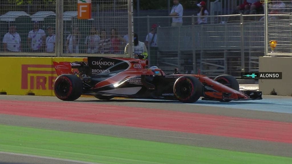 Alonso kurvasi McLareninsa radan varteen formula ykkösten toisissa vapaissa harjoituksissa Azerbaidzhanissa, kun sessiota oli jäljellä alle puoli tuntia.