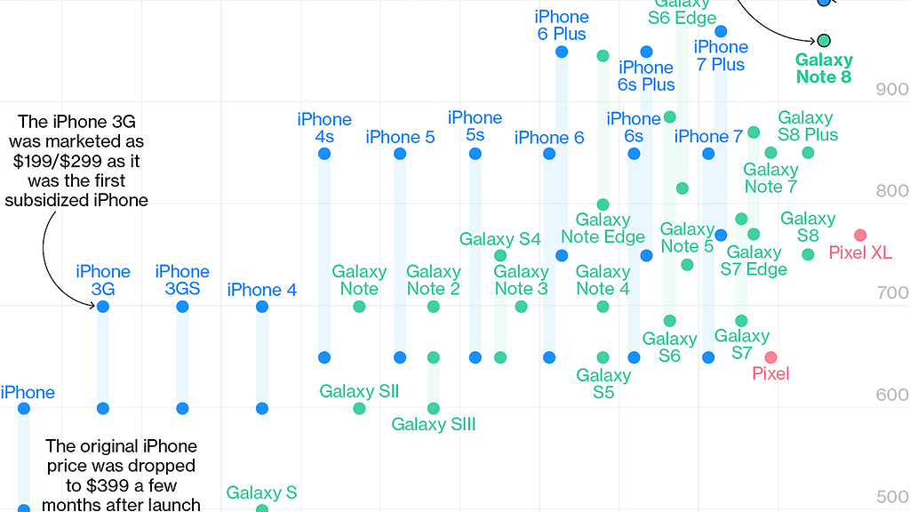 Hieman kuvaa älypuhelinten hintojen noususta keskeisten älypuhelinvalmistajien hintojen korotuksista. Siinä, missä alkuperäisen iPhonen tai Galaxy S:n sai vajaa vuosikymmen sitten 500 dollarilla, ovat nykyhinnat nousseet lähes kaksinkertaisiksi.