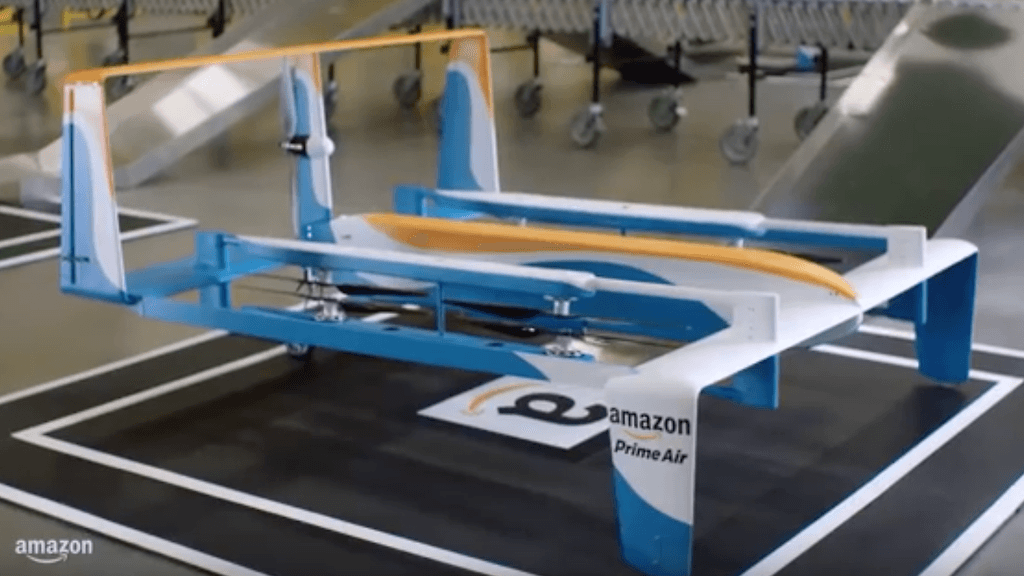 Videolta käy ilmi, kuinka perhe tilaa uudet kengät Amazonin verkkokaupasta ja hetken kuluttua futuristisen näköinen lennokki tuo paketin perheen kotipihalle.
