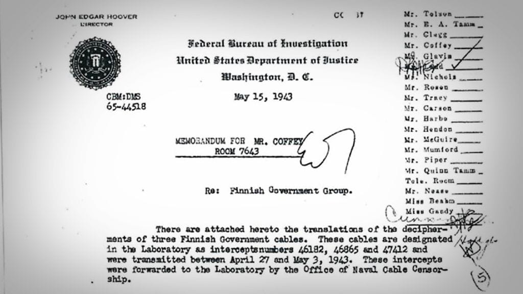 Liittovaltion poliisi ei kyennyt purkamaan koodeja, mutta Yhdysvaltain armeija oli osan selvittänyt. Asiakirjojen mukaan FBI sai koodiavaimet armeijalta. FBI perusti oman kansion suomalaismateriaaleille.
