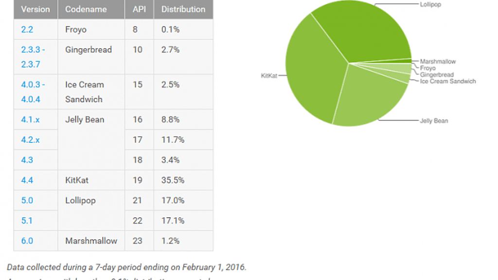 Android-versioiden kuningas on edelleen 4.4 KitKat, joka kattaa 35,5 prosenttia laitteista. Toiseksi kiilaa Lollipop, jonka kaksi versiota kattavat yhteensä 34,1 prosenttia laitteista.