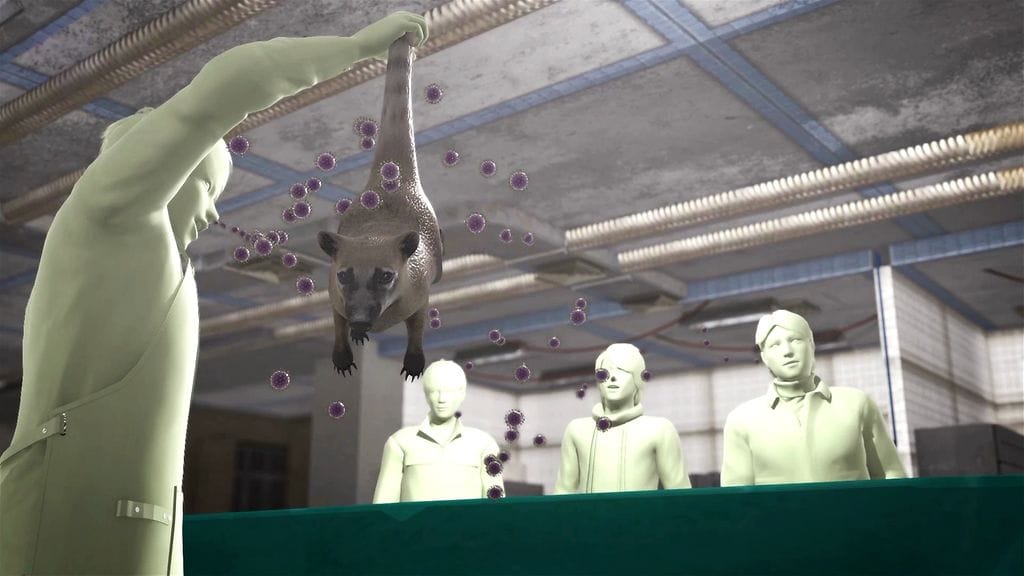 WHO:n mukaan virus pääsi villieläintilalle lepakon kautta. Villieläimistä virus tarttui aina ihmisiin saakka.