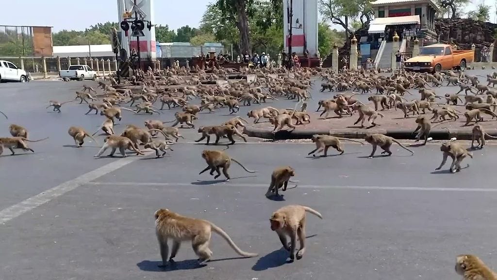 Thaimaassa sadat villiapinat näkevät nälkää koronaviruksen vuoksi. Videolla näkyy, miten sadat nälkäiset apinat taistelevat jäljellä olevista ruoantähteistä. Jopa paikalliset ovat järkyttyneitä apinoiden raivokkuudesta.