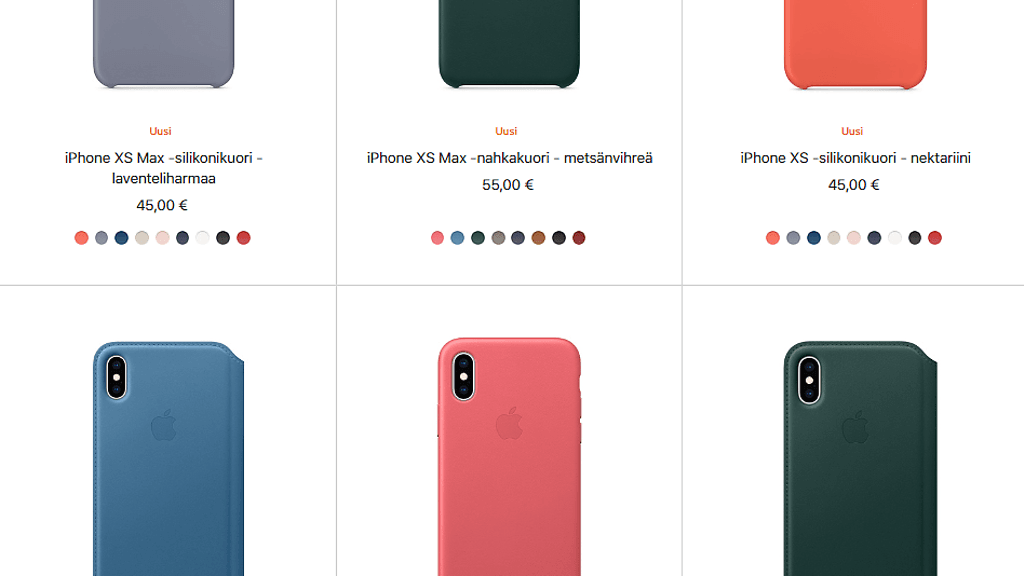 iPhone XS:lle ja iPhone XS Maxille on tarjolla laajasti Applen omia silikonikuoria, nahkakuoria sekä nahkakoteloita. Normaalisti hinnat ovat olleet astetta alhaisemmat pienemmälle iPhonelle, mutta nyt ne ovat kuorien osalta samat. Silikonikuori maksaa 45 euroa ja nahkakuori 55 euroa. iPhone XS:lle nahkakotelo maksaa 119 euroa ja XS Maxille 149 euroa. Uusina väreinä tarjolla on nektariini, laventelinharmaa, airistonsininen, metsänvihreä ja kivenharmaa.