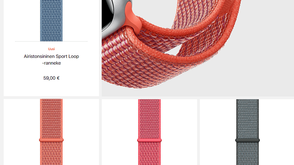 Nailonista tehty Sport Loop -ranneke on nyt saatavilla viidessä uudessa värissä ja ne maksavat 59 euroa. Uusia värejä ovat airistonsininen, kiinanruusu, nektariini, myrskynharmaa ja indigo. Ruostumattomasta teräksestä valmistettu milanolaisranneke on tarjolla nyt kultaisena ja maksaa 159 euroa. Samanhintaiset nahkarannekkeet saivat myös uusia värejä, jotka ovat tummanpinkki, metsänvihreä, airistonsininen ja rubiininpunainen, joka on RED-tuote.