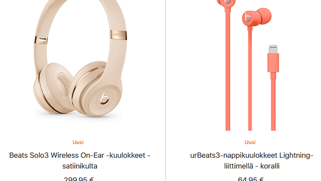 Applen verkkokaupassa Beats Solo3 Wireless -kuulokkeet ovat saatavilla satiinikulta- ja satiinihopea-väreissä. urBeats3-nappikuulokkeet ovat taasen saaneet kolme uutta värivaihtoehtoa, jotka ovat sininen, keltainen ja koralli. Beats Solo3 -kuulokkeet maksavat 299,95 euroa ja urBeats3-kuulokkeet 64,95 euroa.