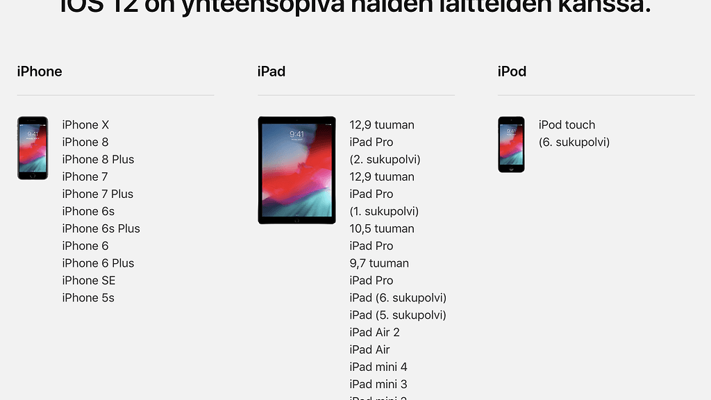 iOS 12 tukee kaikkia samoja laitteita kuin aiempi iOS 11. Tuettuja ovat siis iPhone 5s ja uudemmat, iPad Prot, iPad Airit, pari uusinta iPadia sekä kolme uusinta iPad miniä, sekä uusin iPod touch -sukupolvi. Kaikki tuetut laitteet on listattu kuvassa alla.