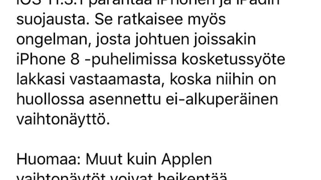 iOS 11.3.1 tuo mukanaan tietoturvakorjauksia sekä ratkaisee ongelman, jonka myötä iPhone 8 -puhelimissa niihin vaihdetun epävirallisen näytön kosketus saattoi lakata toimimasta.