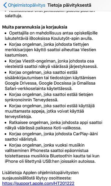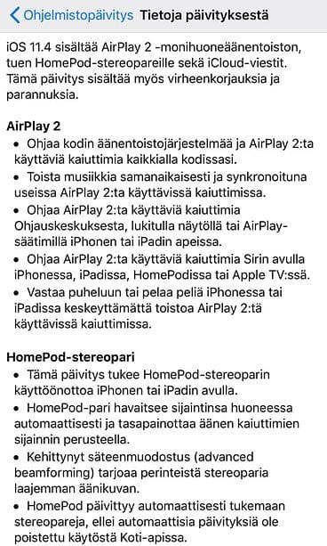 Apple on julkaissut uuden iOS 11.4 -päivityksen iPhonelle ja iPadille. Päivityksen suurin uudistus on AirPlay 2, joka ei kuitenkaan vaikuta täkäläisiin käyttäjiin kovinkaan paljoa. iOS 11.4 tulee saataville OTA-päivityksenä (over-the-air) ja se voi tulla saataville vaiheittain eri laitteille.