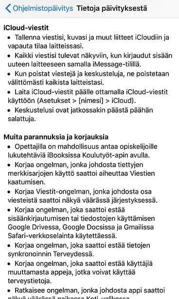 Päivitys vie mukanaan käyttäjän viestit iCloudiin. Tästä muutoksesta Apple kertoi jo viime vuoden WWDC-kehittäjäkonferensissa, mutta se saapui laitteisiin vasta nyt. Viestit iCloudissa (Messages on iCloud) siirtää Applen Viestit-sovelluksen viestikeskustelujen sisällön tallentamisen pilveen, mikä mahdollistaa tallennustilan vapauttamisen itse laitteesta ja viestien jatkuvan synkronoitumisen käyttäjän eri laitteisiin.