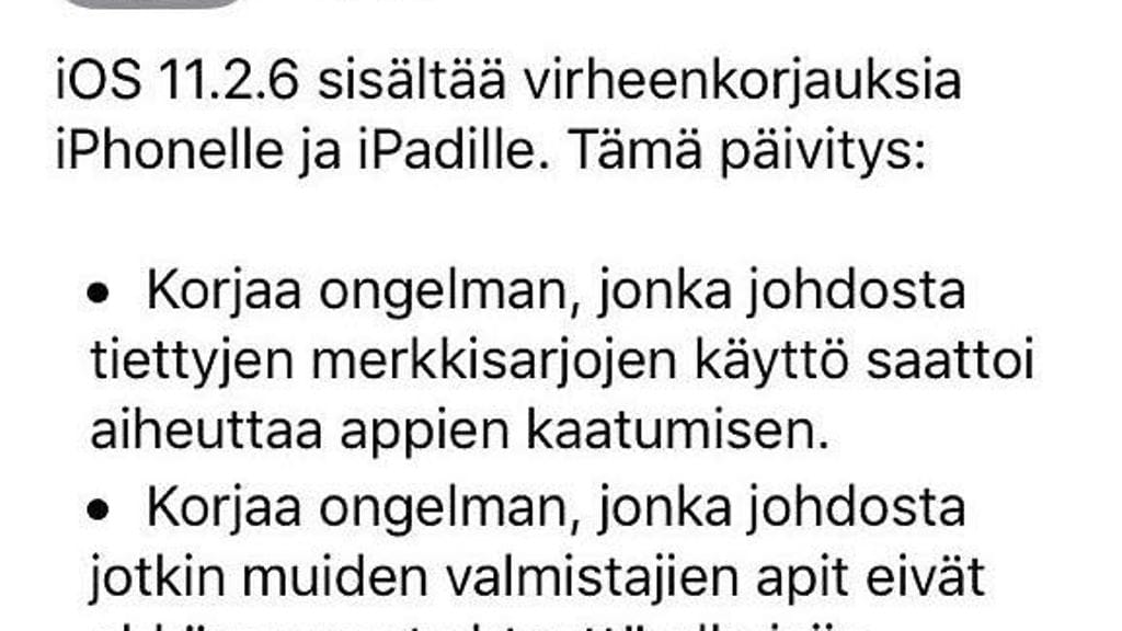 iPhonelle, iPadille ja iPod touchille uusi päivitys on iOS 11.2.6. Se korjaa lisäksi toisen ongelman, jonka johdosta jotkin muiden valmistajien sovellukset eivät mahdollisesti saaneet yhteyttä ulkoisiin lisälaitteisiin.