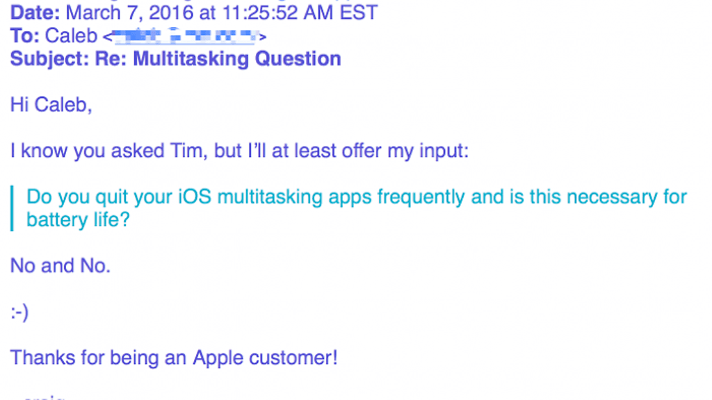 Nimeltä mainitsematon Apple-asiakas lähetti Applen toimitusjohtajalle Tim Cookille sähköpostia kysyen, sulkeeko hän taustalla olevia sovelluksia usein ja onko se tarpeellista akkukeston pidentämiseksi. Kysyjä ei saanut vastausta itse Cookilta, mutta iOS:n kehitystä vetävä Federighi tarjosi oman painavan vastauksensa: ”Ei ja ei”. Federighi ei siis sulje taustalla olevia sovelluksia eikä siitä myöskään olisi etua toiminta-ajoille.