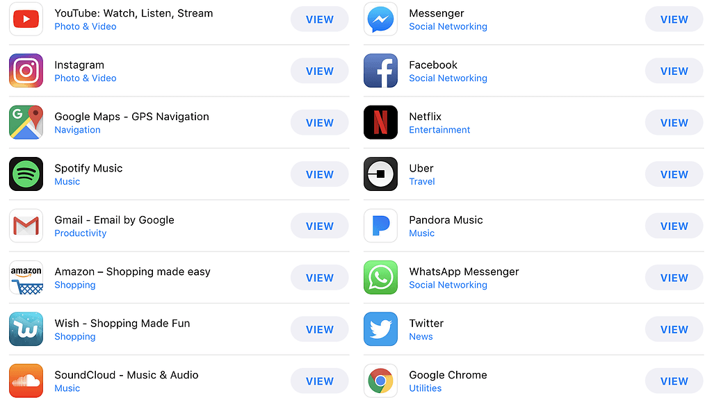 Apple tarjoaa katsauksen myös vuoden 2017 suosituimpiin App Store -sovelluksiin. Alla näkyvät listaukset koskevat Yhdysvaltoja. Suomessa suosituimpiin sovelluksiin pääsee tutustumaan App Storen etusivulta.