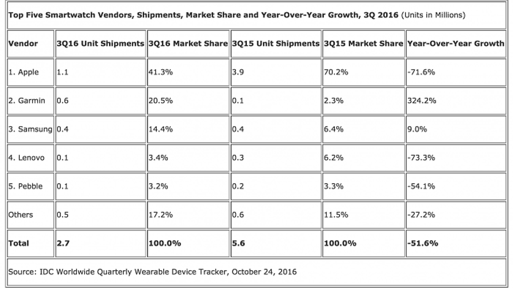 Yhteensä älykellojen toimitukset laskivat vuotta aiemmasta 5,6 miljoonasta vain 2,7 miljoonaan, joka on surkean pieni luku. Vertailun vuoksi esimerkiksi älypuhelimia toimitetaan vuosineljänneksittäin yli satakertaisesti.