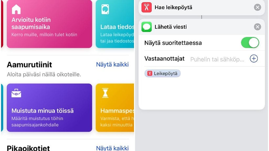 Uudella Oikotiet-sovelluksella voi siis nopeasti tehdä yksittäisiä tai useampia asioita, jotka ovat käyttäjälle rutiineja. Sirin lisäksi Oikotiet-toiminnot voi käynnistää widgettien kautta, jotka sijaitsevat sovellusvalikon vasemmalla puolella.