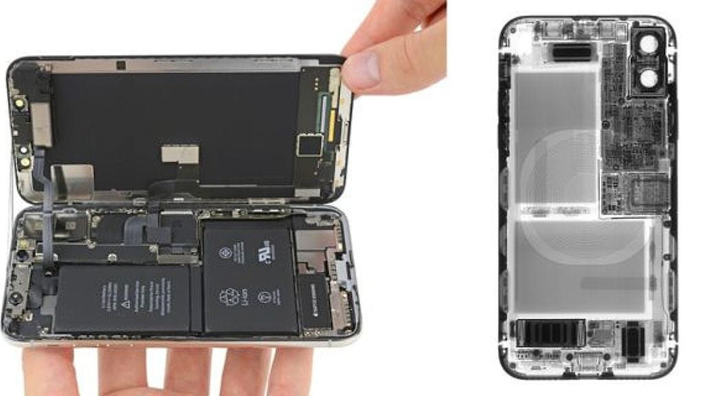 Mielenkiintoisimpia iPhone X:n sisuskaluista lienevät sen akku ja piirilevy. Akusta on tilan säästämiseksi tehty tavallisesta poiketen kaksiosainen, ja se erottuu kuvista selvästi L-kirjaimen muotoisena alueena. Piirilevy puolestaan on ikään kuin taiteltu ennen yhtenäiseksi juottamista, joka mahdollistaa sen, että se sisältää enemmän komponentteja kuin iPhone 8:n vastaava vieden samalla reilusti vähemmän tilaa.