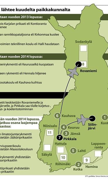Puolustusvoimat aikoo lakkauttaa ensi vuoden loppuun mennessä Pohjois-Karjalan prikaatin Kontiolahdella, Kotkan rannikkopataljoonan ja Ilmavoimien teknillisen koulun Jämsässä. Vuoden 2014 loppuun menessä aiotaan puolestaan lakkauttaa Pioneerirykmentti Keuruulla, Hämeen rykmentti Lahdessa ja Lentosotakoulu Kauhavalla.