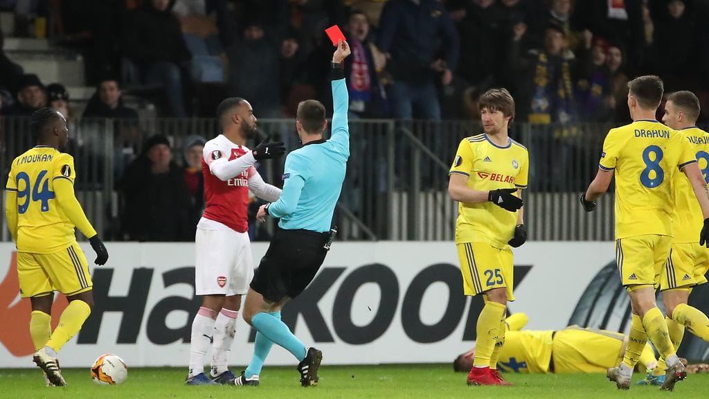Lacazette huiski vastustajaa kyynärpäällään ulosajon arvoisesti joukkueiden avauskohtaamisessa Valko-Venäjällä torstaina. BATE johti tuossa vaiheessa 1-0, joka jäi myös lopputulokseksi.