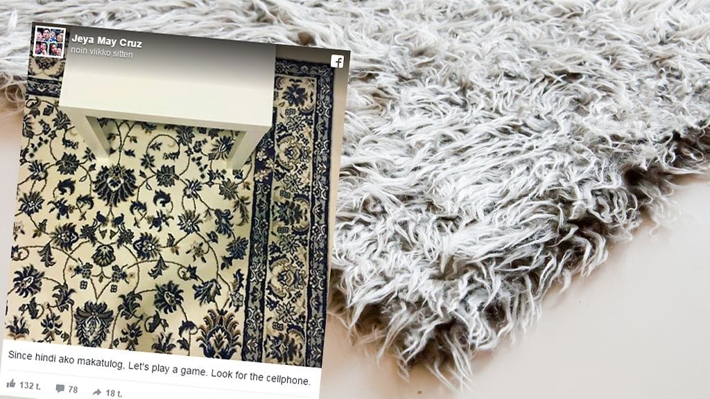 Erään filippiiniläisnaisen Facebookissa jakama kuva osoittaa, että älypuhelimen voi hukata pelkän maton päällä. Löydätkö itse tästä kuvasta puhelinta?