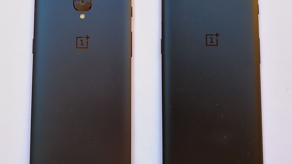 OnePlus 5:ssä on myös sukunäköä vasemmalla olevaan OnePlus 3T:hen, sekin Midnight Black -erikoisvärisenä kuvassa.