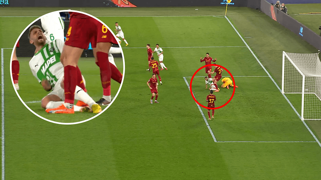 Ensimmäisen puoliajan lopussa AS Roman puolustaja Marash Kumbulla joutui painitilanteeseen Sassuolo-hyökkääjän kanssa maalin edessä. Kumbulla oli jo päästä törkytempustaan kuin koira veräjästä, mutta videotuomarit olivat tarkkana, ja lopulta Kumbullalle näytettiin suora punainen kortti.