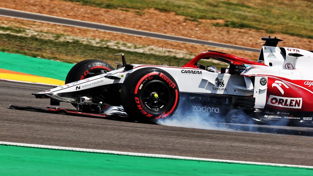 Räikkönen nousi ensimmäisen kierroksen aikana kaksi sijaa ylöspäin tallikaverinsa Antonio Giovinazzin kantaan. Kun ensimmäinen kierros oli päättymässä, Räikkönen kolaroi keskellä Portimãon radan pääsuoraa Giovinazzin vasempaan takarenkaaseen.