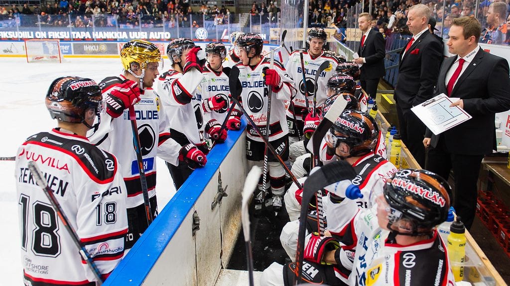Twiitin päättää kuva Ässien vaihtoaitiosta, jossa valmennuksen ja pelaajan katseet suuntaavat hämillisinä ylöspäin.