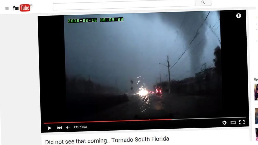 Yhdysvalloissa Etelä-Floridan läpi kulki voimakas tornado, joka aiheutti paljon tuhoja. Uhkarohkeita autoilijoita oli liikenteessä enemmänkin synkästä ilmasta huolimatta.