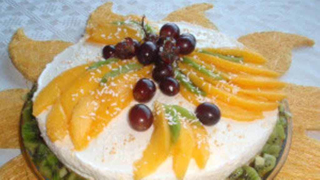 mangoa, persikkaa ja kiiviä viipaleina, viinirypäleitä, kookoshiutaleita ja helmiäis-kakunkoristeita
