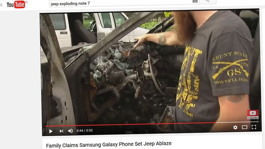 Samsungin Galaxy Note 7 -puhelimen viallisen akun arvellaan polttaneen auton poroksi Floridassa, Yhdysvalloissa. Tuhot tallentuivat nähtäville sosiaaliseen mediaan.