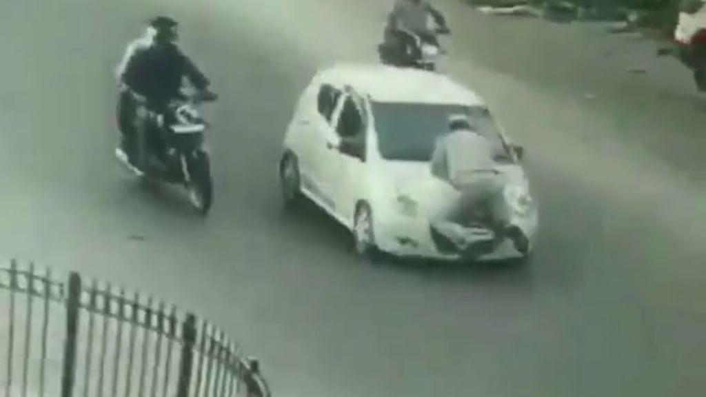Valvontakamera tallensi erikoisen näyn Intiassa, kun poliisivirkailija roikkui henkilöauton konepellistä keskellä liikennettä. Tapaus sattui sunnuntaina Intiassa.