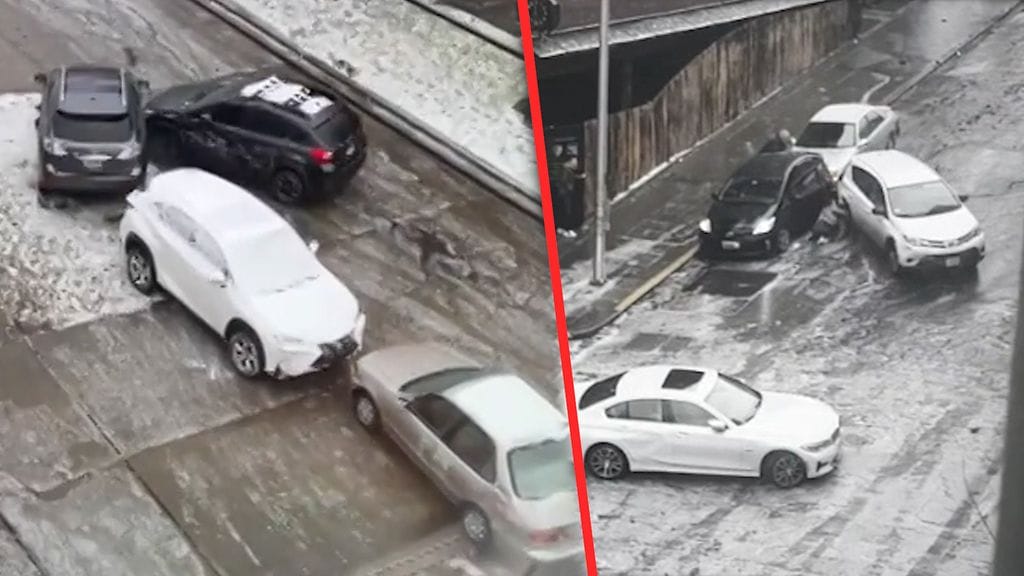 KameraOnen julkaisemalla videolla uhkarohkean kuljettajan matka keskeytyy osumaan useampaan pysäköityyn autoon, jotka liukuvat muiden pysäköityjen autojen perään.