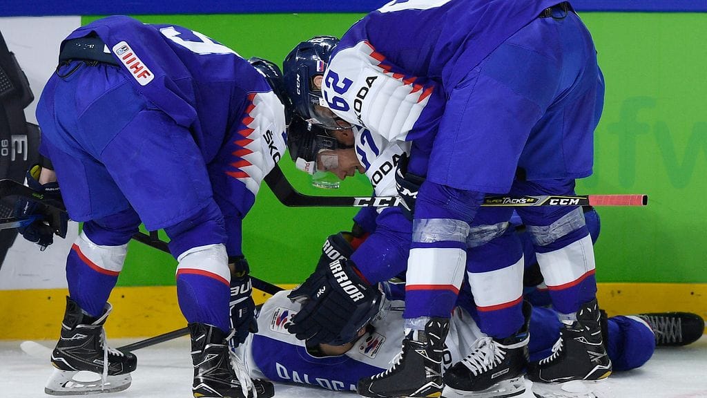 Slovakian puolustaja Marek Daloga sai ikävän osuman kiekosta toisessa erässä Suomea vastaan jääkiekon MM-kisoissa.