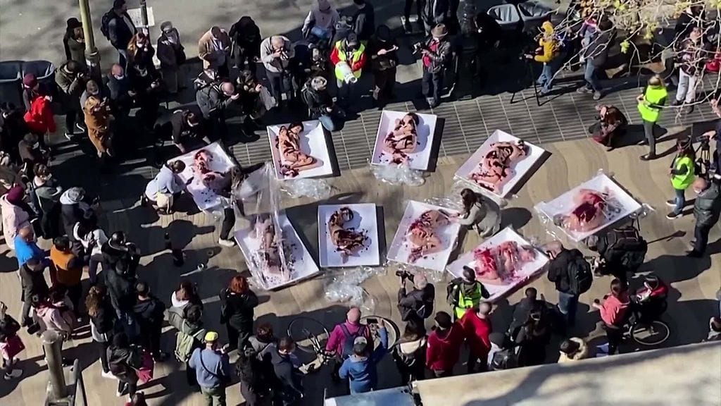 Barcelonan keskustassa nähtiin tänään pysäyttävä mielenilmaus, kun maassa makasi alastomia ja verisiä "ihmisruumiita."