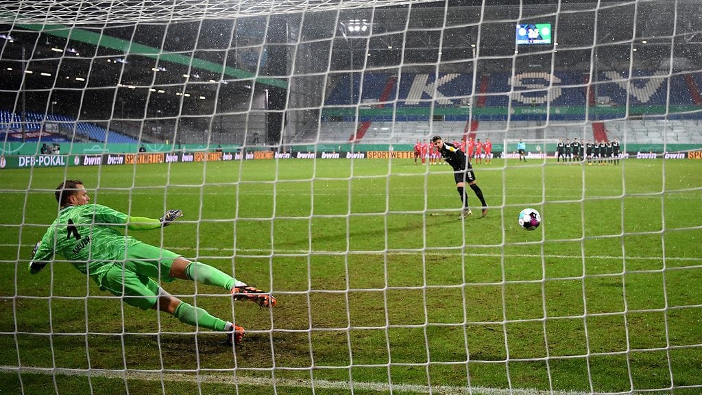Kummankin joukkueen ensimmäiset viisi laukojaa tekivät maalin rangaistuspotkukisassa, kunnes Marc Rocan veto pysähtyi Holstein Kielin maalivahtiin Ioannis Geliosiin. Seuraava laukoja Fin Bartels upotti vetonsa verkkoon ja aloitti kieliläisten juhlat räntäsateessa.