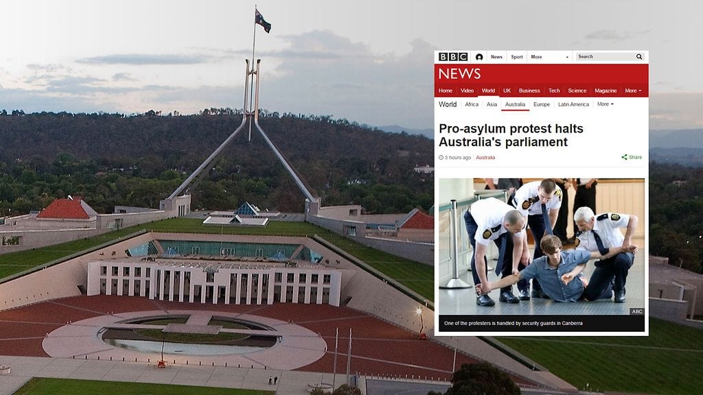 Australian parlamentissa nähtiin erikoinen mielenosoitus, kun aktivistit liimasivat kätensä kiinni kaiteisiin, kertoo BBC.