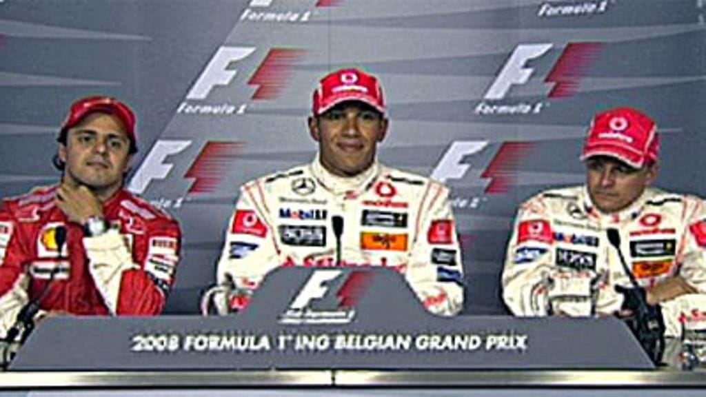 Formula ykkösten Belgian GP:n aika-ajon lehdistötilaisuudessa paikalla paalupaikkamies Lewis Hamilton (LH), kakkosruutuun ajanut Felipe Massa (FM) sekä kolmosruutuun ajanut Heikki Kovalainen (HK).