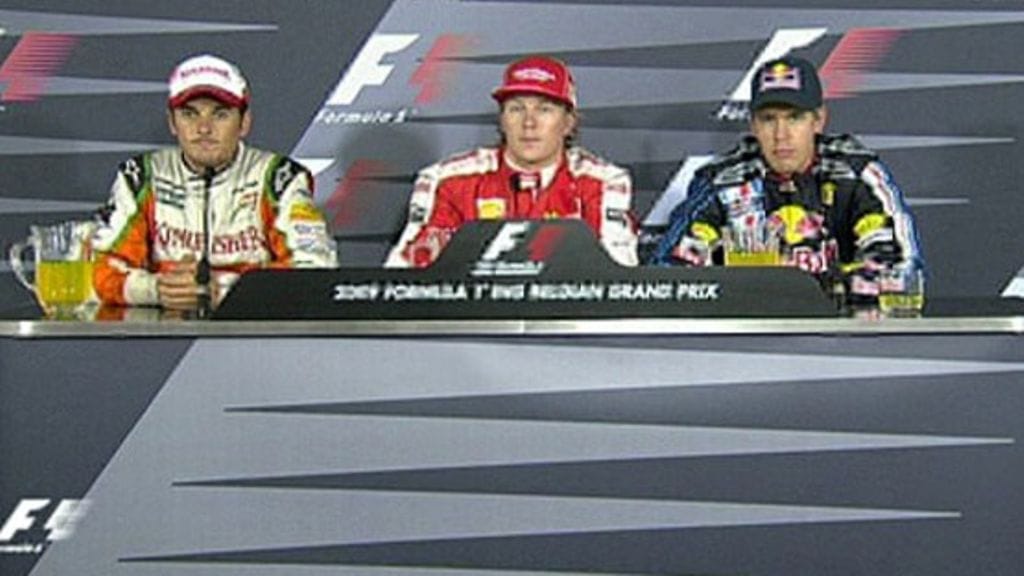 Belgian GP:n lehdistötilaisuudessa paikalla voittaja Kimi Räikkönen (KR), toiseksi sijoittunut Giancarlo Fisichella (GF) sekä kolmanneksi ajanut Sebastian Vettel (SV).