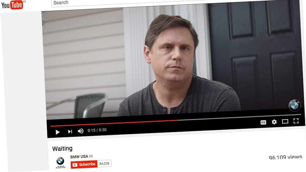 "Waiting"-nimellä ristitty mainos kertoo, että autonostaja voi joko odottaa "sen toisen" sähköautovalmistajan tulevaa mallia, tai sitten ostaa BMW 330e:n ja ajaa sillä heti.