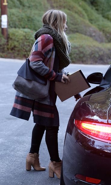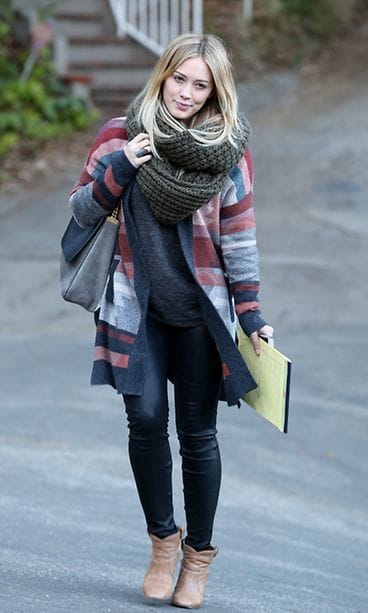 Näyttelijä Hilary Duff, 26, kuvattiin poistumassa ystävänsä asunnolta rennossa, mutta tyylikkäässä asussa. Duff oli pukenut ylleen nahkalegginsit, harmaan neuleen ja värikkään neuletakin. Lisäksi näyttelijä hautautui suureen, vihreään huiviin. Jalkaansa Duff oli vetänyt beiget korkokengät, ja hänen suuri laukkunsa yhdisteli hauskasti harmaata ja mustaa.