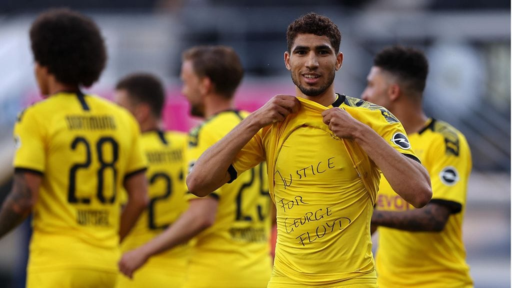 Sancho ja Hakimi paljastivat pelipaitansa alta t-paidan, jossa oli englanniksi teksti "Oikeutta George Floydille".