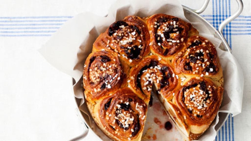 Levitä pullataikinalevyt erilleen sulamaan ja kohoamaan jauhotetun leivinpaperin päälle pellille n. 40-asteiseen uuniin (peitettyinä). Laita kuivatut marjat turpoamaan likööriin taikinoiden sulamisen ajaksi.