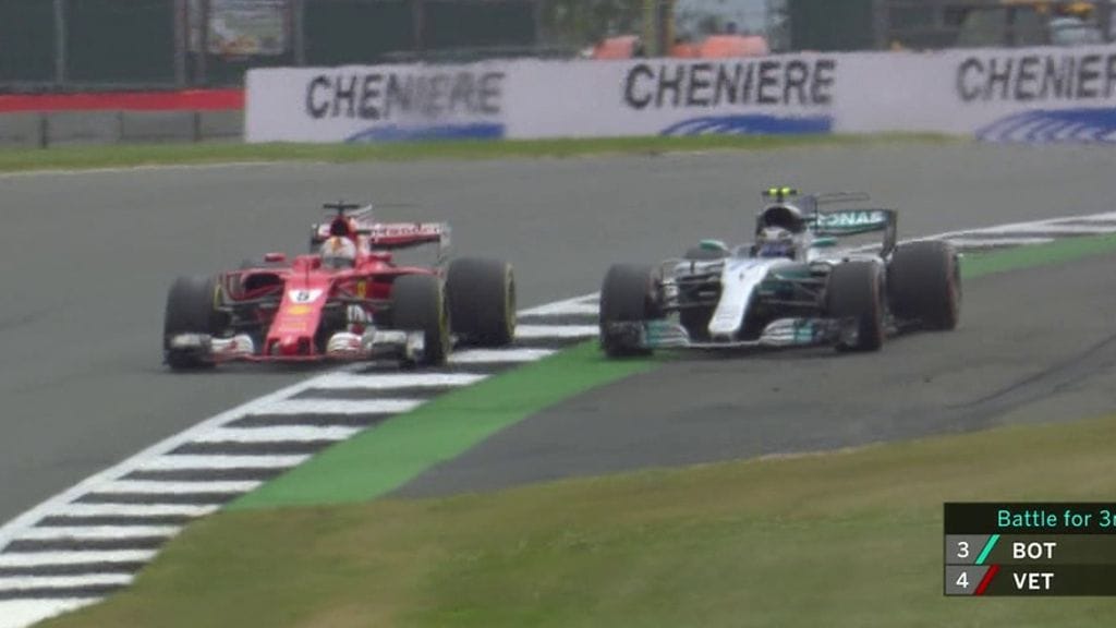 Bottas myrskysi eroa nopein askelin kiinni ja pääsi iskuetäisyydelle, kun kisaa oli jäljellä 10 kierrosta. Bottas hyökkäsi heti rohkeasti ulkokautta, mutta Vettel onnistui puolustautumaan ja suomalainen ajautui radalta ulos. Hetkeä myöhemmin Vettel oli voimaton, kun Bottas tuli väkisin edelle ja kolmossijalle.