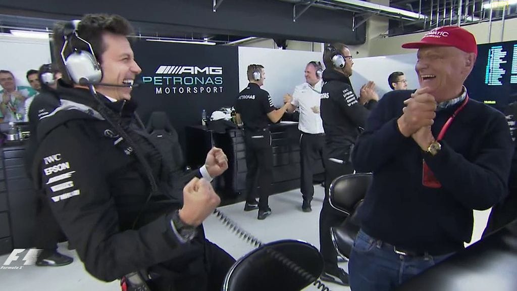 Tämä kelpasi Mersun johtoportaan Toto Wolffille ja Niki Laudalle. Varsinkin Wolff tuuletti todella vapautuneesti tallin pilttuussa Bottaksen ykköspaikan varmistuttua (video yllä).