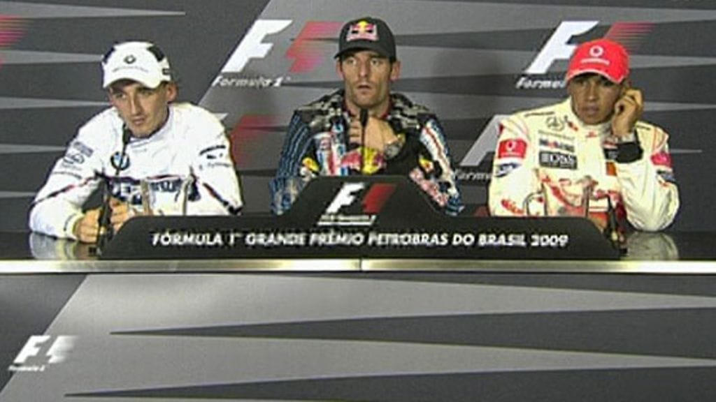 Brasilian GP:n lehdistötilaisuudessa paikalla voittaja Mark Webber (MW), toiseksi sijoittunut Robert Kubica (RK) sekä kolmanneksi ajanut Lewis Hamilton (LH).